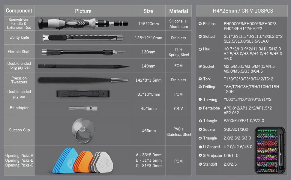 Imaginez pouvoir rĂ©parer n'importe quel appareil sans jamais chercher le bon tournevis. C'est exactement ce que permet ce kit ingĂ©nieux. Avec ses 108 embouts magnĂ©tiques diffĂ©rents, il s'adapte Ă toutes les vis, mĂȘme les plus rares. Les embouts sont organisĂ©s par type et taille, et le code couleur vous fait gagner un temps prĂ©cieux. Plus besoin de fouiller dans une boĂźte Ă outils dĂ©sordonnĂ©e !